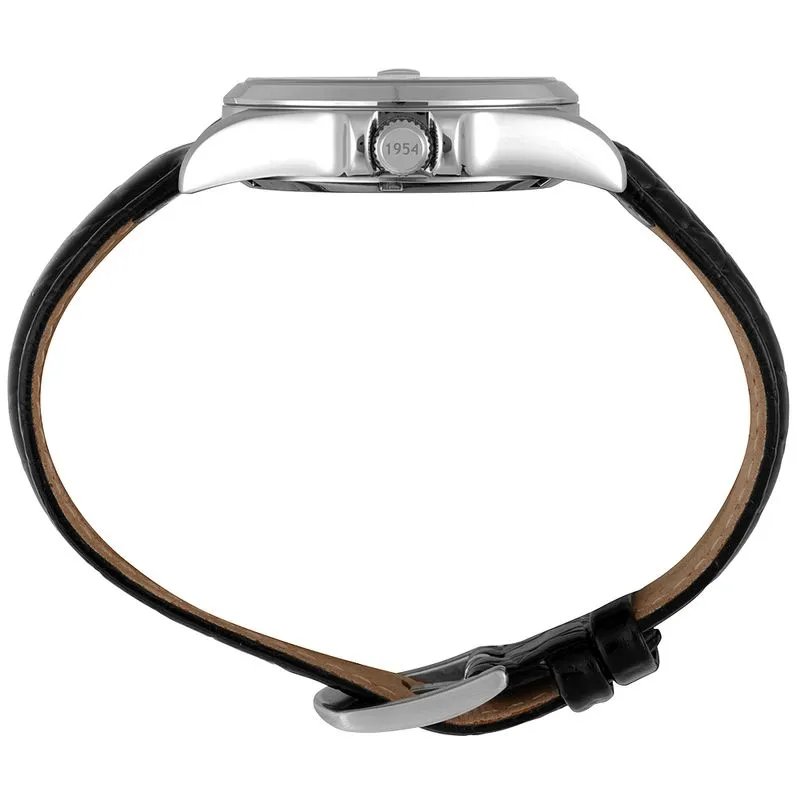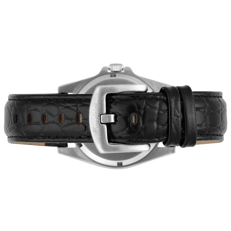 Para finalizar o design, o relógio traz uma pulseira em couro legítimo na cor preta, oferecendo flexibilidade e resistência. Sua especificação técnica de 10 ATM permite contato intenso com a água, tornando-o uma peça versátil e resiliente para diferentes situações.