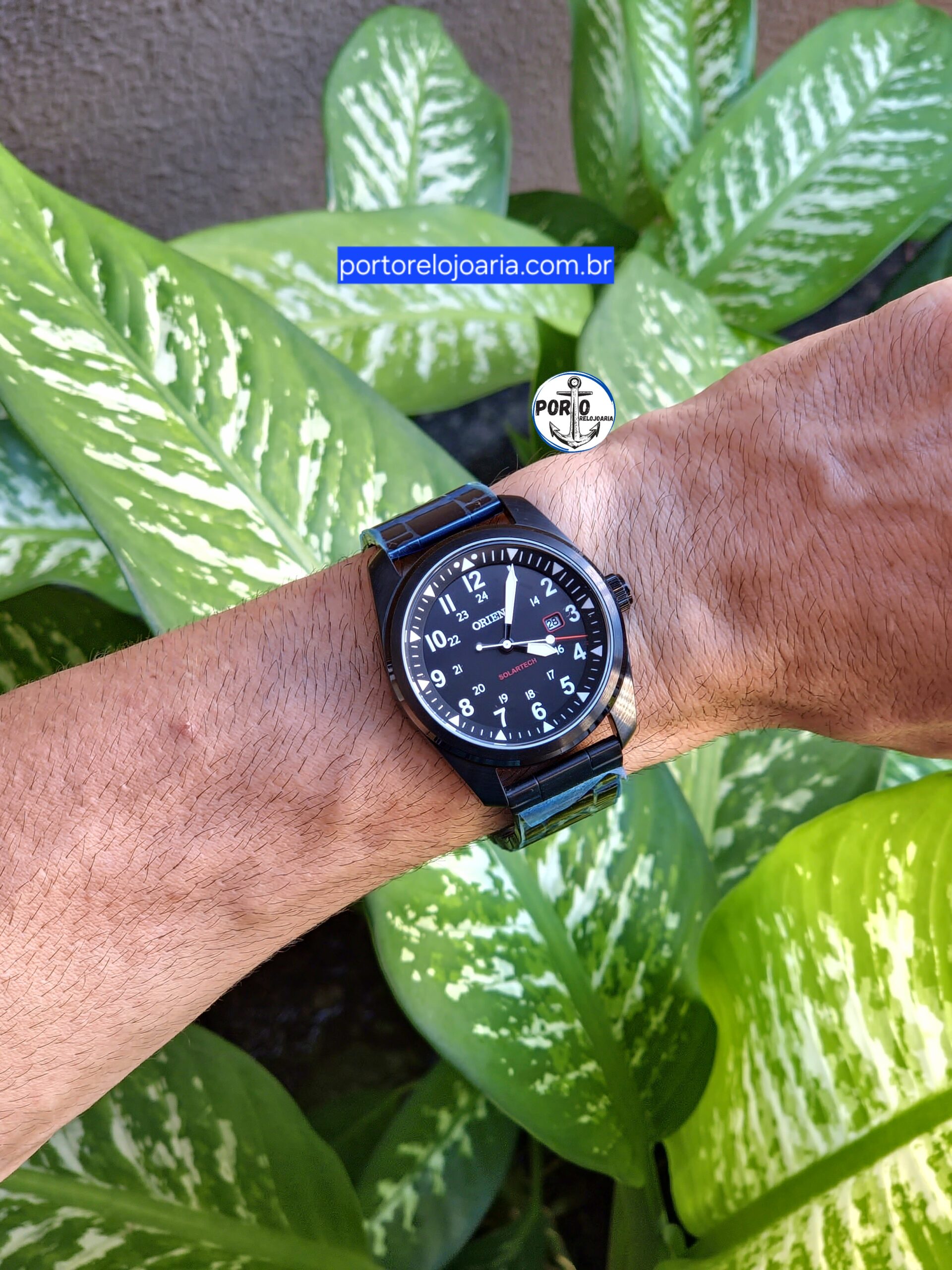 Características: com caixa em aço e pulseira em aço, ambos com íon plate black, lúmen nos ponteiros e índices