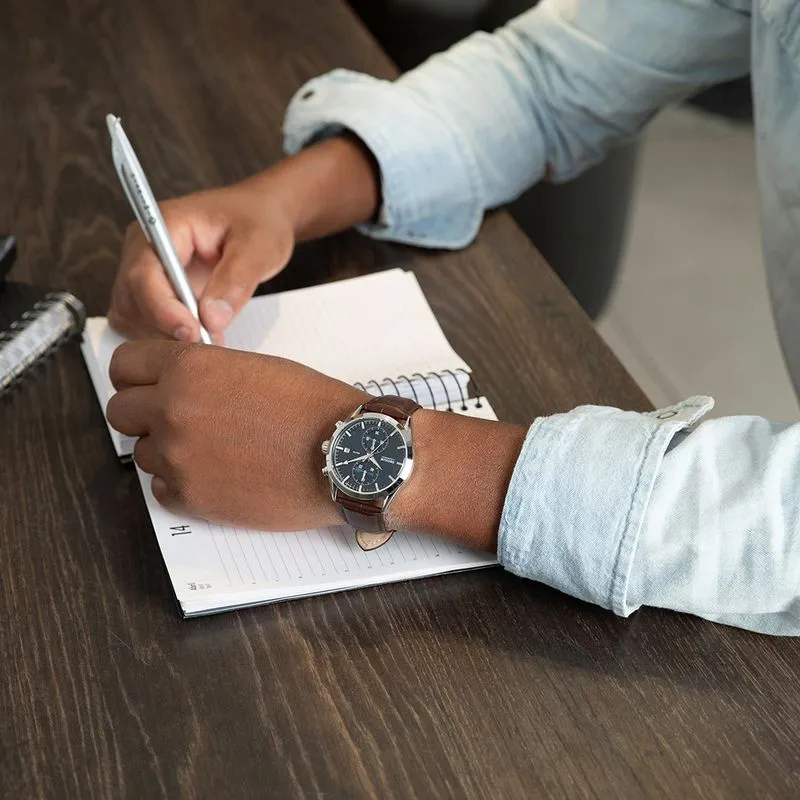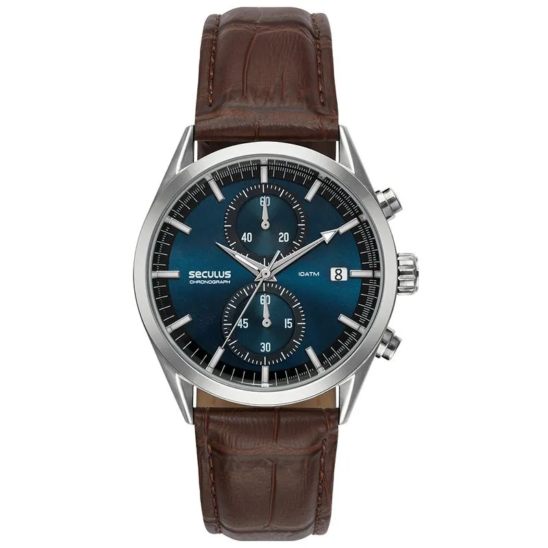 Este relógio cronógrafo cromado combina elegância e funcionalidade em um só acessório, com uma caixa robusta de aço inoxidável de 40mm de diâmetro e acabamento dourado. O vidro abaulado protege o mostrador azul em camadas e cria um efeito visual exclusivo. Também conta com ponteiros luminosos, proporcionando melhor visibilidade em ambientes com pouca luz. A pulseira de couro marrom com textura croco, tem um design que foi projetado para se ajustar perfeitamente a todos os tamanhos de pulso, tornando este cronógrafo uma escolha ideal para quem busca unir sofisticação e alto desempenho.