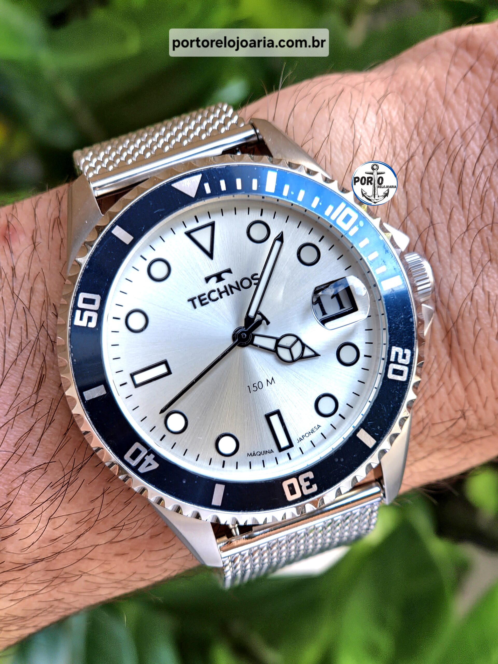 Relógio Technos Acqua apresenta elementos indispensáveis para aventuras submersas, como o aro externo giratório com acabamento corrugado e lente antireflexo com lupa de calendário, além do mostrador na cor prata com ponteiros e marcadores de hora luminescentes, que ainda conta com formas geométricas nos marcadores de hora. Produto 100% em aço inoxidável, com pulseira de aço inoxidável em mesh, banhado em prata, com máquina quartz japonesa Miyota, calendário e resistência à água de até 150 metros.