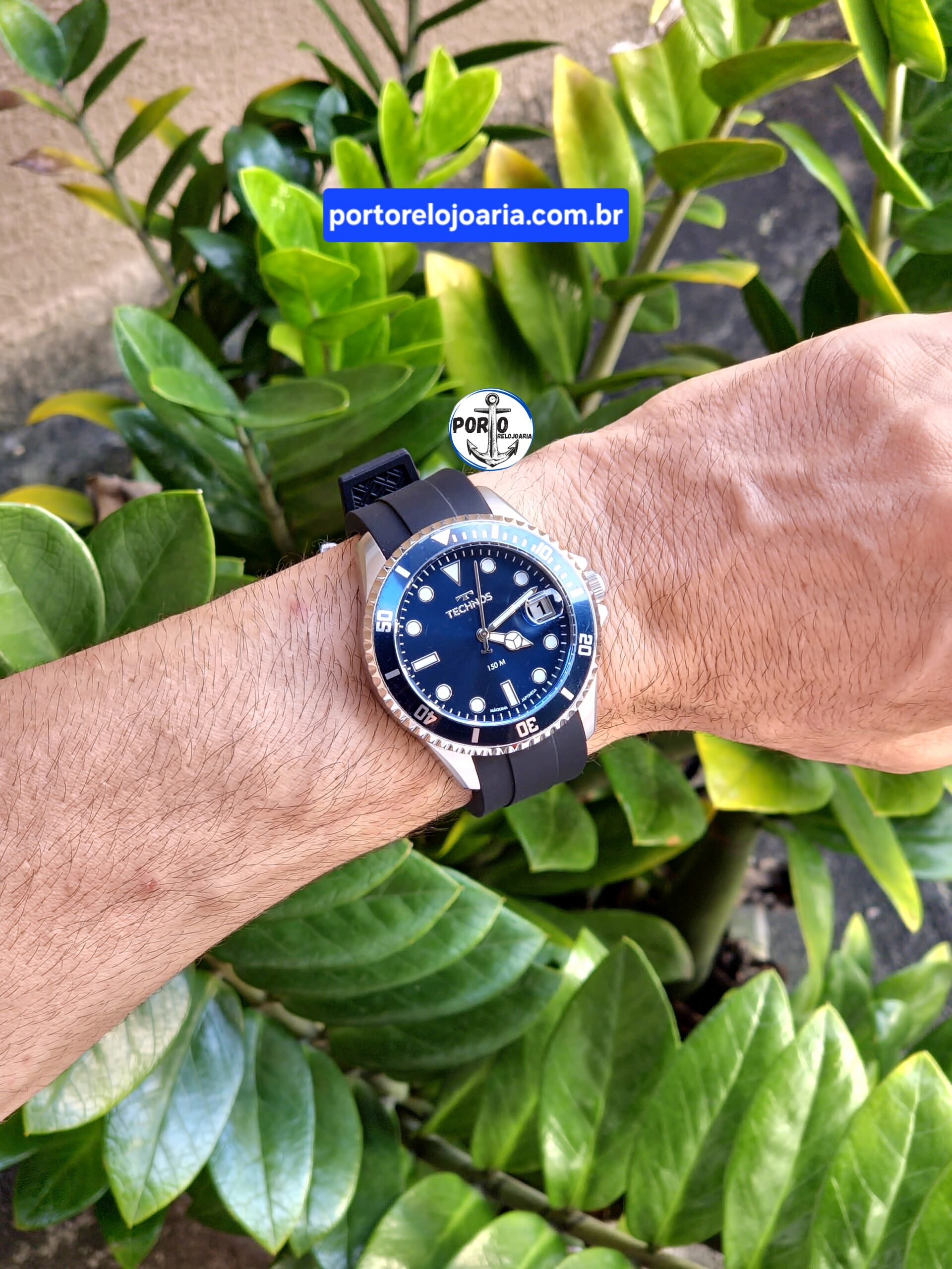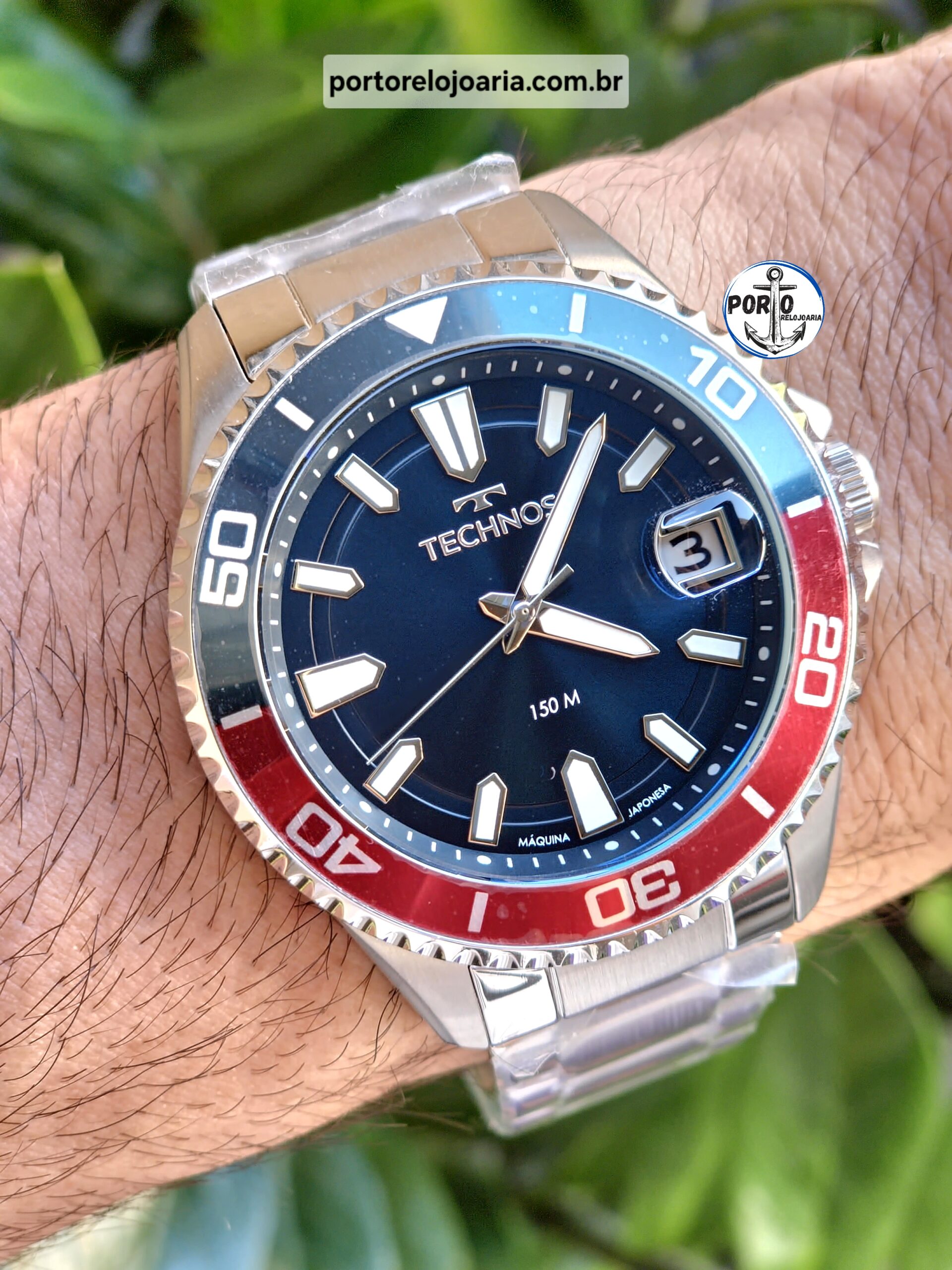 Relógio Technos Aqua apresenta elementos indispensáveis para aventuras submersas, como o aro externo giratório com acabamento corrugado e lente antireflexo com lupa de calendário, além do mostrador com ponteiros e marcadores de hora luminescentes. Seu mostrador ainda conta com formas geométricas nos marcadores de hora. Produto 100% em aço inoxidável, pulseira de silicone na cor preta, com máquina quartz japonesa Miyota, calendário e resistência à água de até 150 metros.