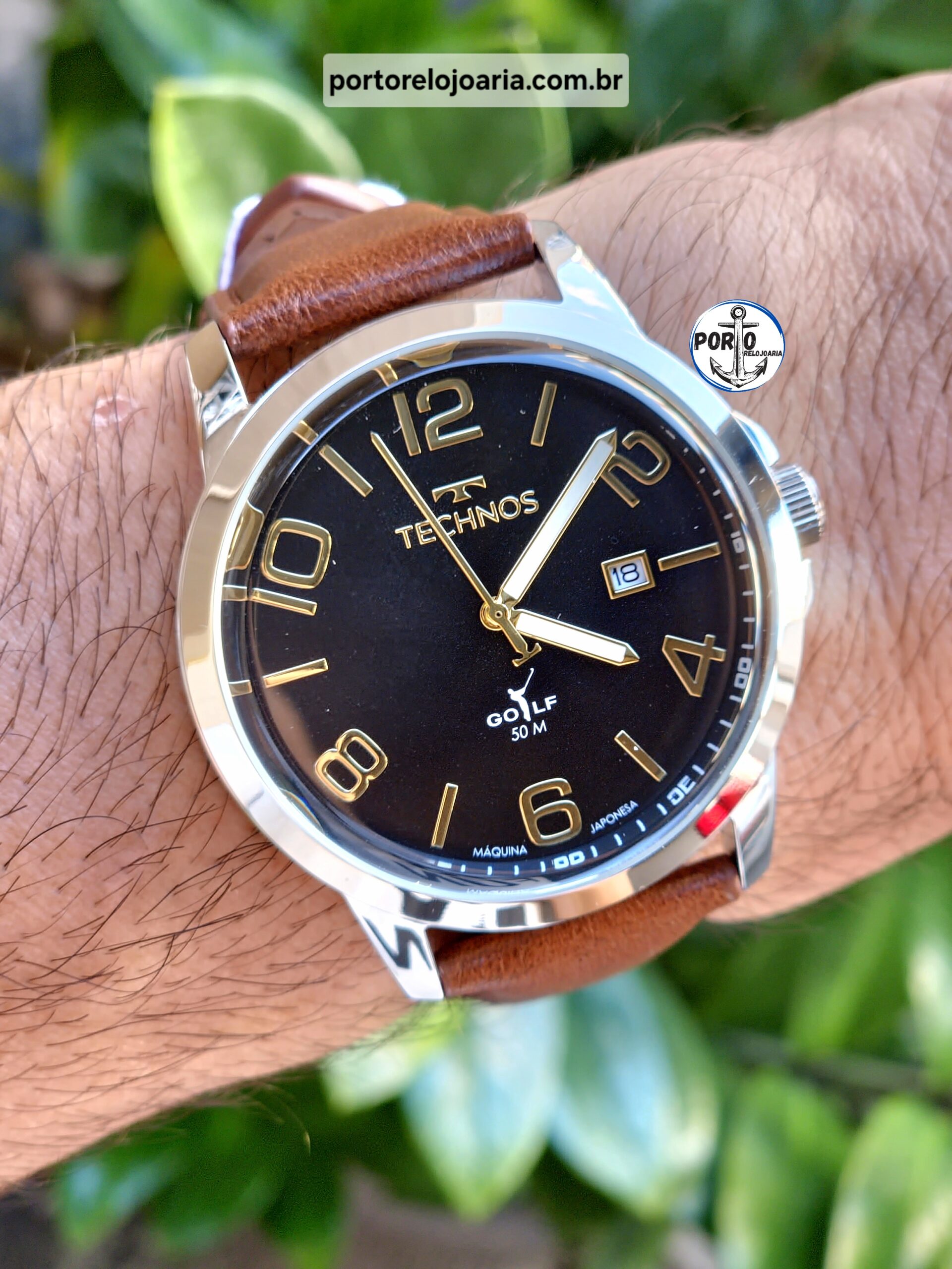Relógio Golf lança um novo modelo. Ele apresenta mostrador analógico com data na cor preto, com assinatura de linha, e lente abaulada, além de contar com pulseira de couro legítimo na cor marrom. Produto 100% em aço inoxidável, banhado em prata e resistente à água de 50 metros.