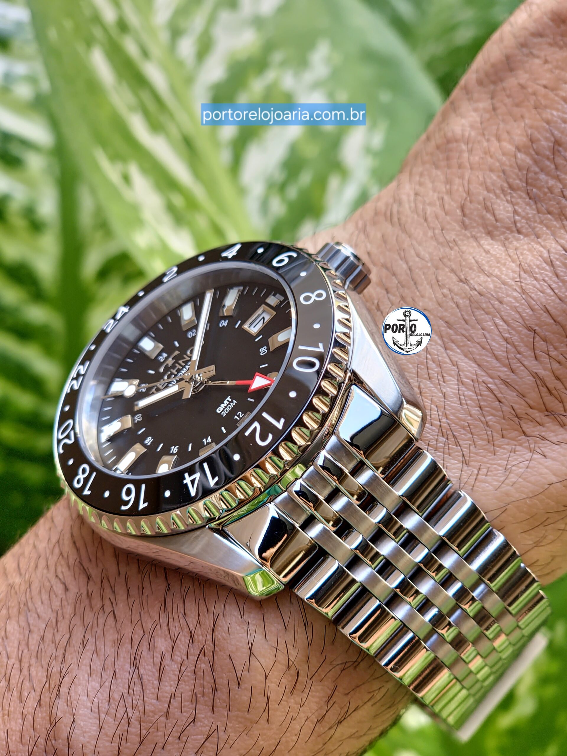 Ele é movido pela precisão do maquinismo automático japonês GMT, com 24 jewels e reserva de marcha de 41 horas. O aro externo giratório bidirecional, com aplicação de cerâmica e acabamento corrugado, possibilita alterar fusos com apenas uma rotação, enquanto a clássica lente de safira protege o mostrador de riscos e arranhões.