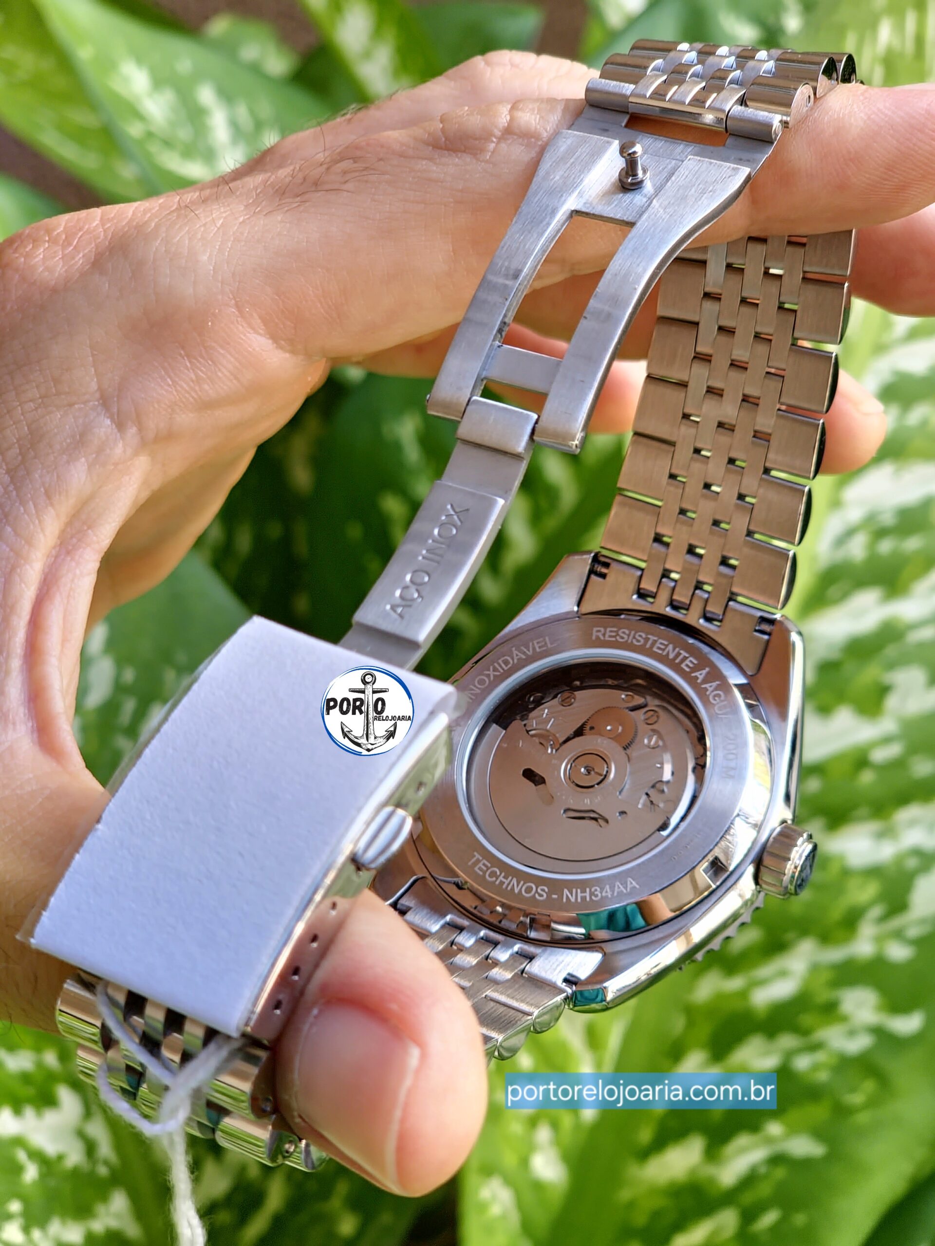 Seu mostrador, rico em detalhes, apresenta ponteiros e marcadores de hora luminescentes, que garantem excelente legibilidade em qualquer ambiente. O fundo de vidro rosqueado revela a sofisticação do movimento mecânico, reforçando o prestígio da peça.