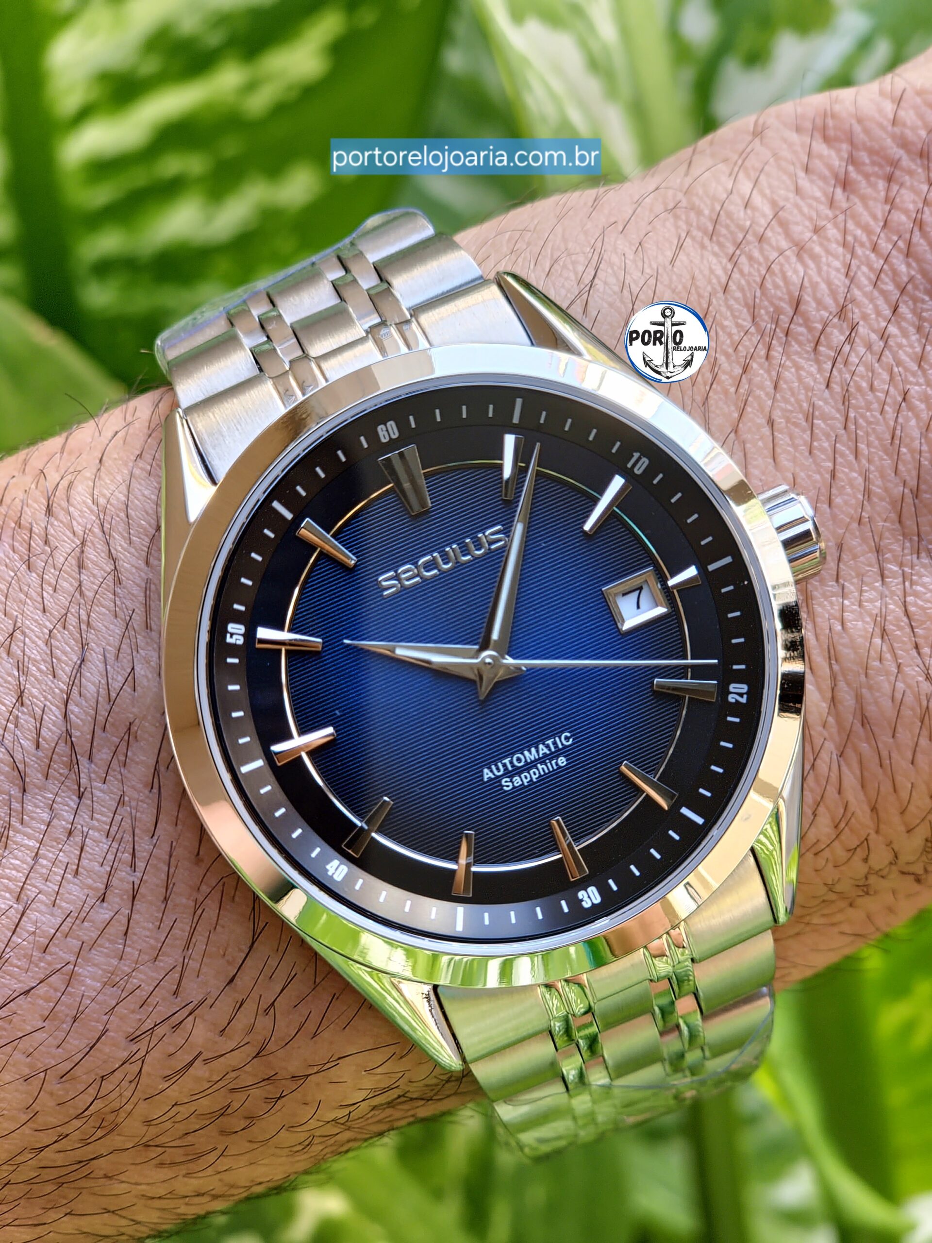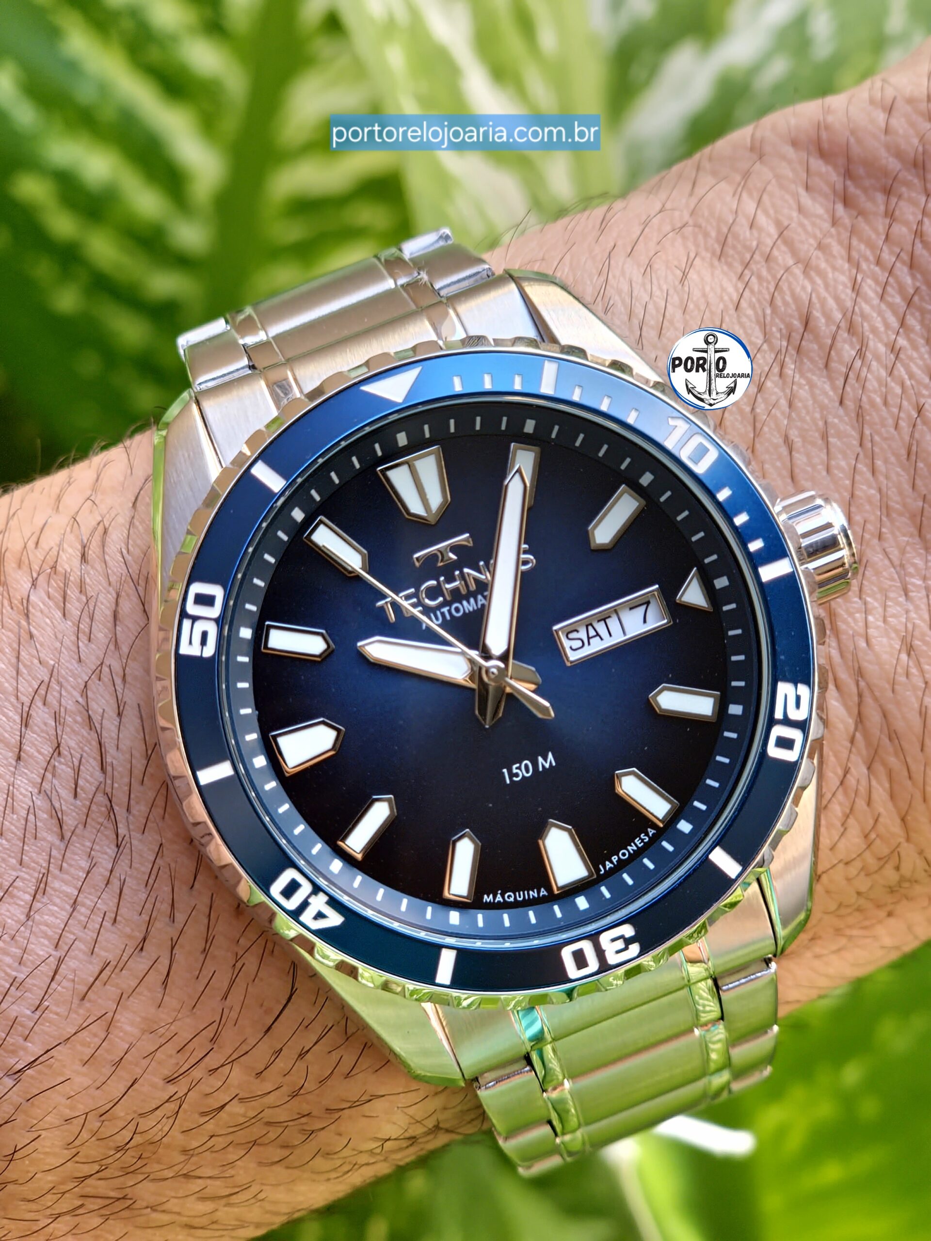 O Technos Automático Diver apresenta o clássico design de mergulho, inspirado nos modelos lançados pela Technos na década de 70, que fizeram história no Brasil. Ele conta com a precisão do maquinismo automático, com 21 jewels, reserva de marcha de 42 horas e função hacking, além da presença do calendário daydate e fundo de vidro rosqueado, que permite a visualização do movimento mecânico das engrenagens. Com resistência à água de 150 metros, o modelo também apresenta elementos fundamentais para aventuras submersas, como o aro externo giratório unidirecional com acabamento corrugado e mostrador azul com efeito luminescente nos ponteiros e marcadores de hora, além dos marcadores de hora em formas geométricas, fator que facilita a leitura das horas. Seu sistema de impermeabilização é configurado pela tripla vedação na coroa, além da coroa ser rosqueada para oferecer ainda mais segurança ao mergulhar. Acompanha estojo especial