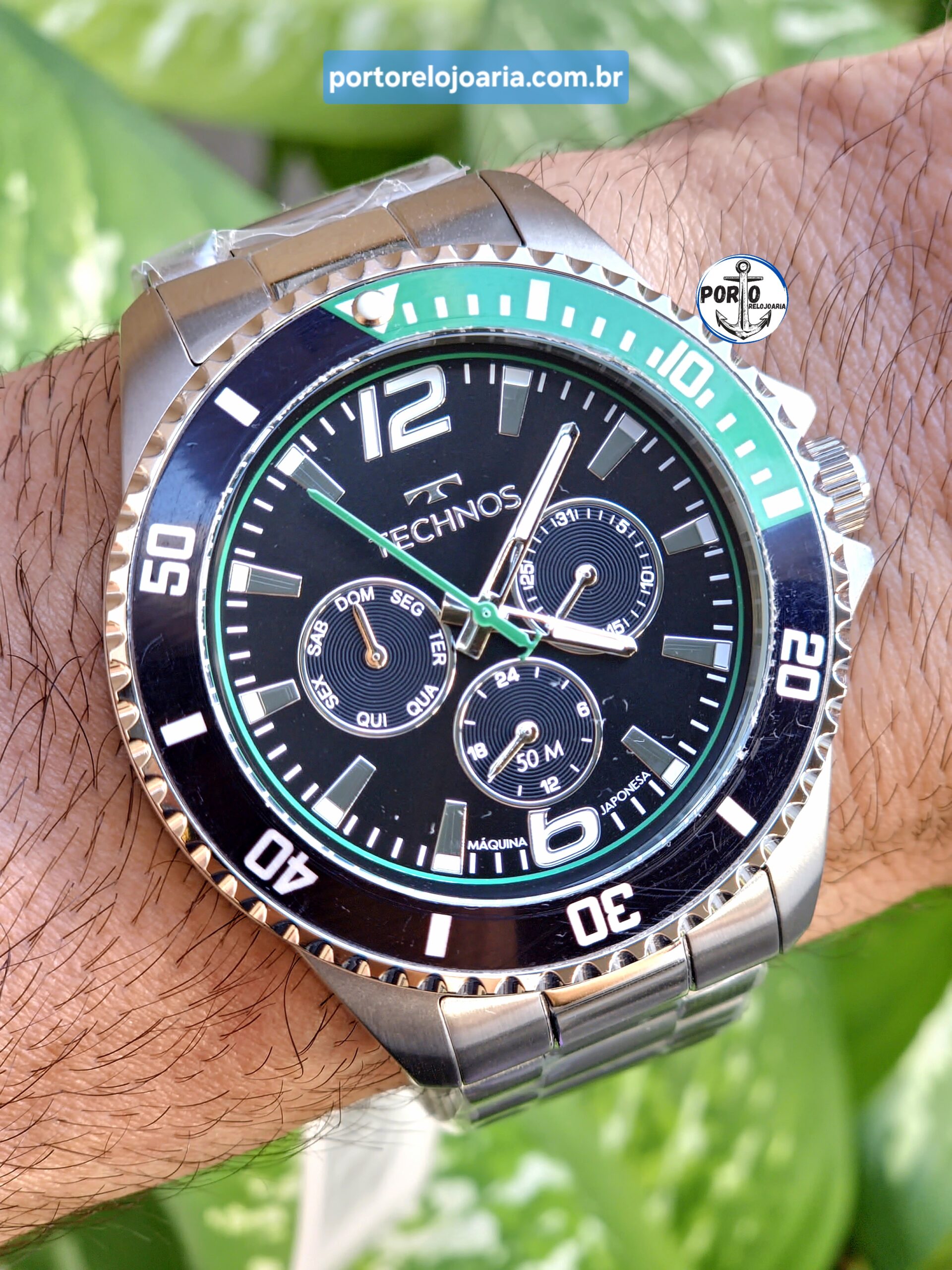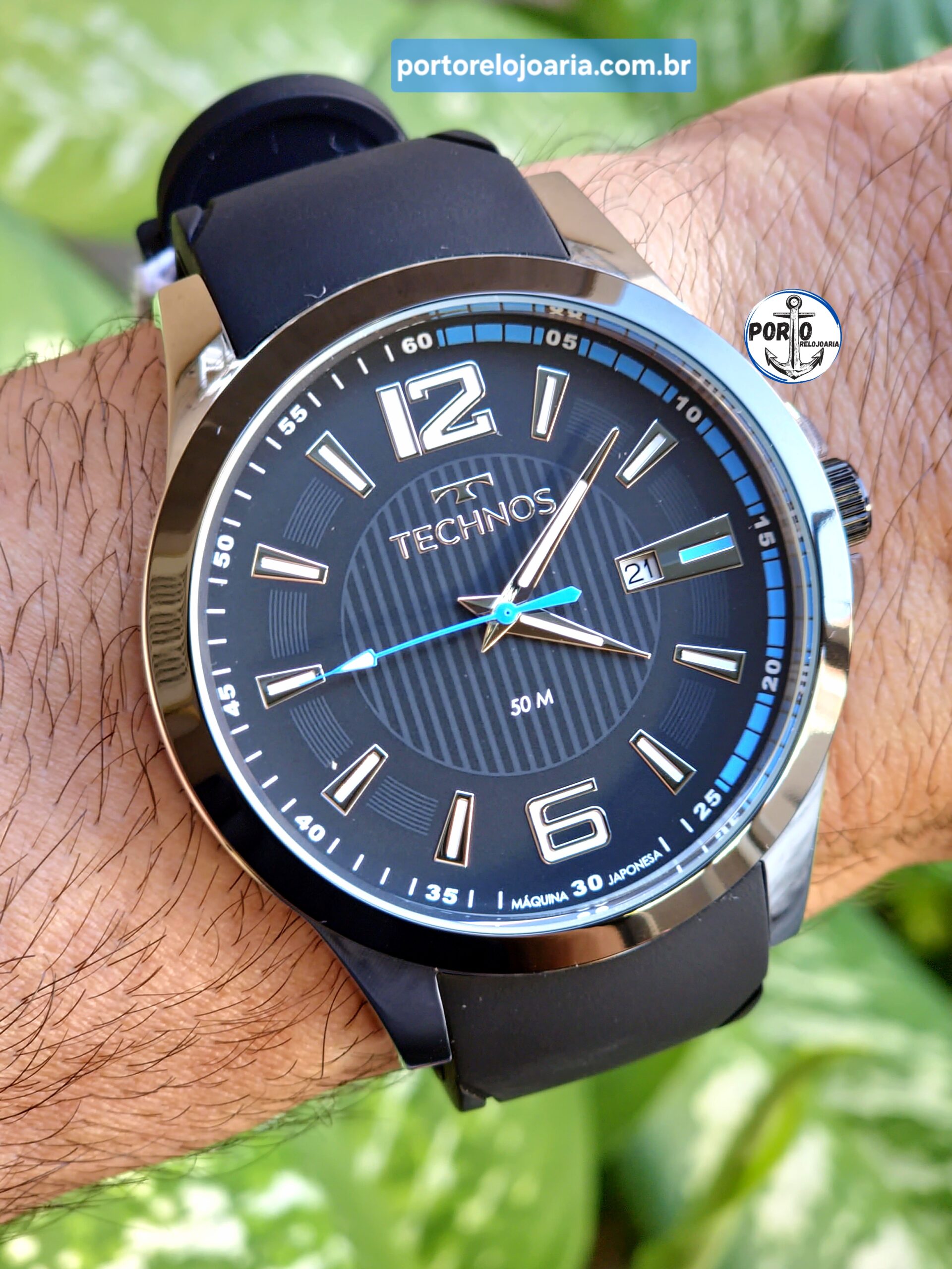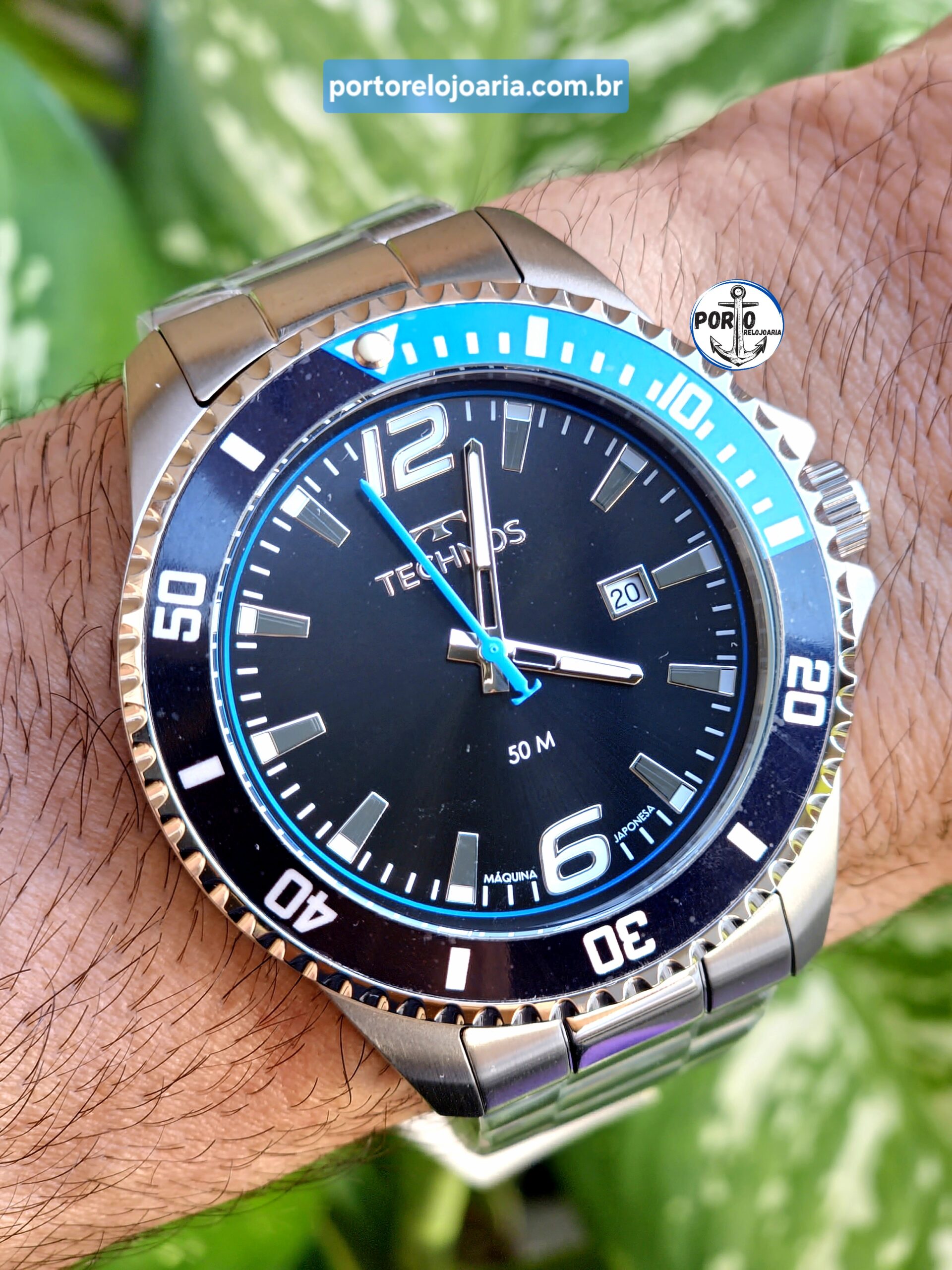 Relógio Technos Racer com design esportivo, inspirado no universo automobilístico. Ele apresenta um diferenciado aro de alumínio, bicolor preto/azul, com acabamento dentado e marcações em relevo. Produto em aço inoxidável, com máquina quartz japonesa Miyota, calendário e resistência à água de 50m. Tamanho de caixa 46mm.
