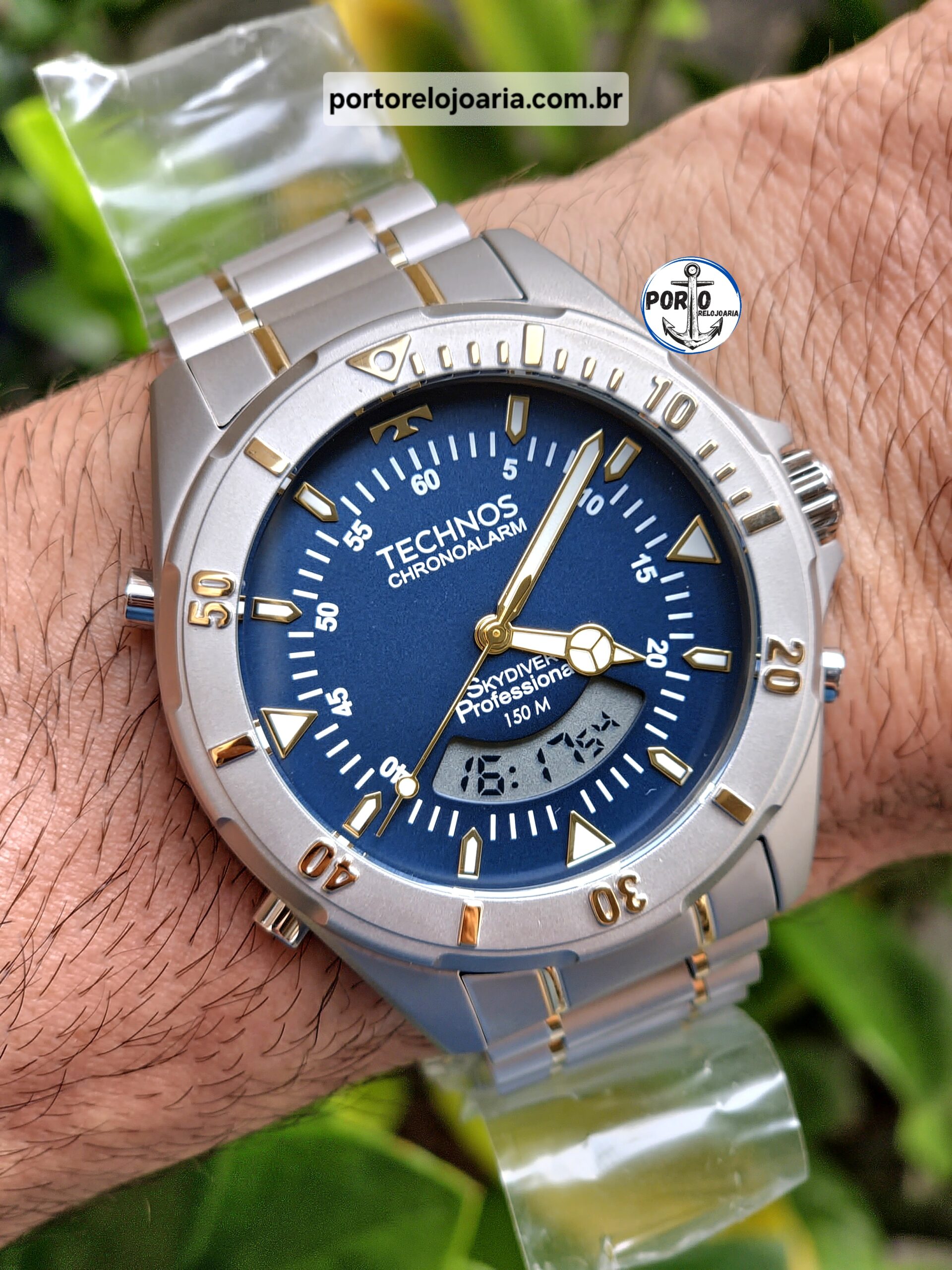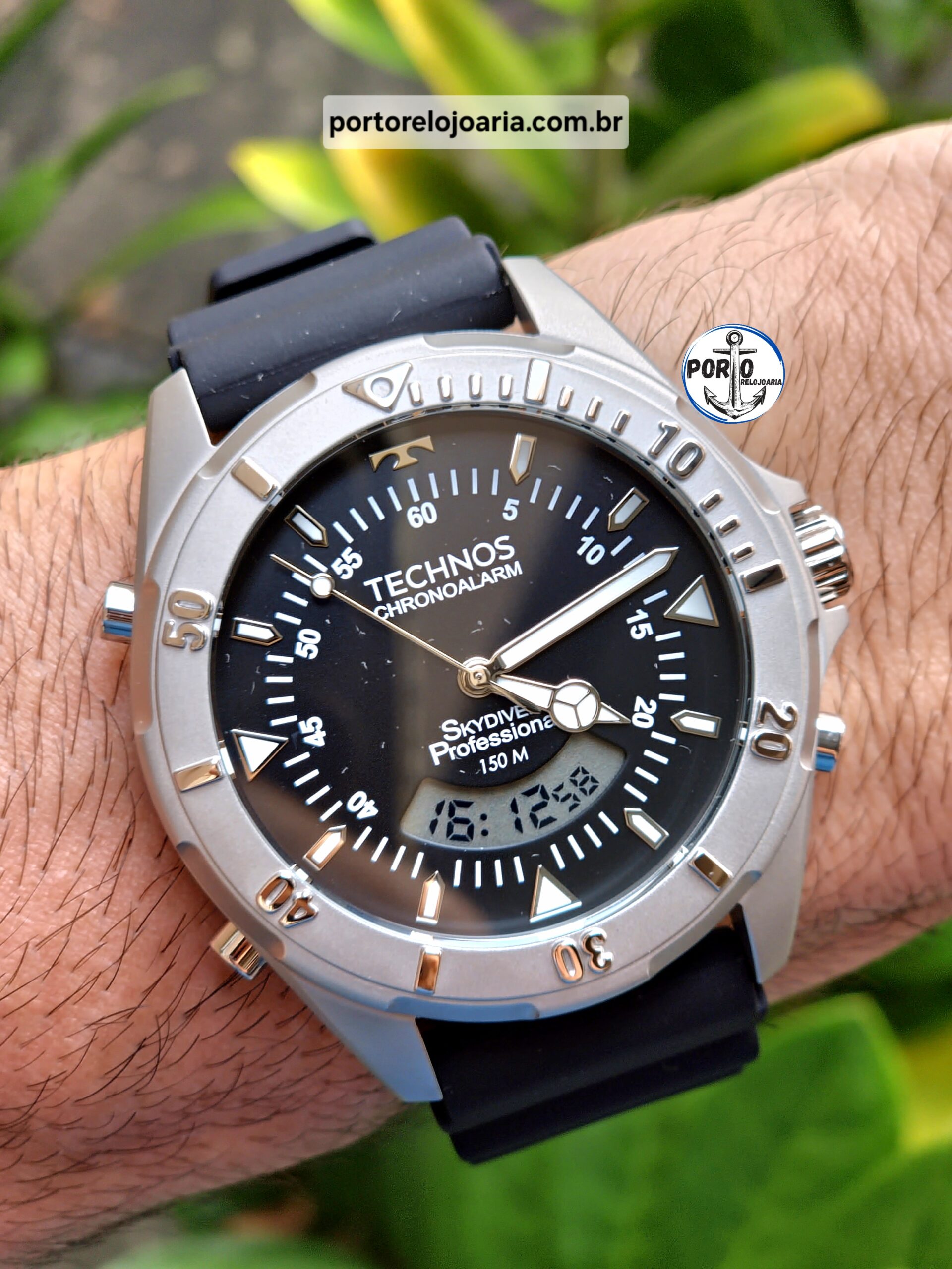 Relógio Technos Skydiver apresenta seu novo lançamento, de maquinismo anadigi com novo módulo exclusivo com 4 baterias, oferecendo maior durabilidade ao relógio, e com aro giratório unidirecional. Além disso, ele apresenta mostrador de fácil leitura com marcadores de hora luminescentes, além de cronógrafo e aro corrugado. Produto 100% em aço inoxidável, com pulseira de silicone na cor preta, com resistência à água de 150 metros.